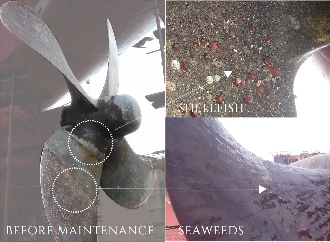 When marine growth accumulates on a propeller’s surface or surface roughness increases due to aging, propeller efficiency lowers and fuel consumption increases. To lower fuel consumption, fuel-saving polishing, where propeller blades are polished to reduce blade roughness, is effective.