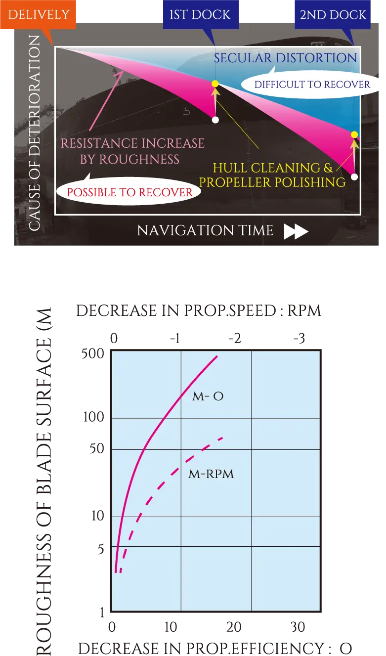 The fuel efficiency of the ship begins to fall immediately after going on service. This is caused by secular distortion of main engine and bigger resistance caused by rougher surface on hull and propeller. In some vessel types, its speed downs abt. 0.3-0.5 knot in 10 years after going on service.
