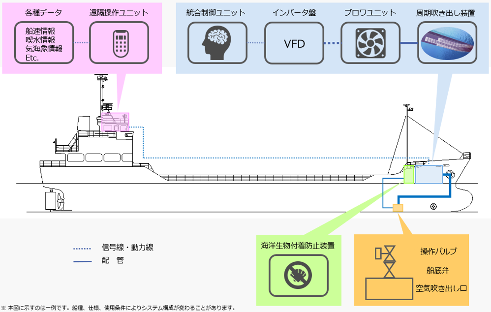 By installing a cyclical discharge control unit inside the vessel, the air outlets are sequentially activated, enabling periodic air release along the hull bottom.
