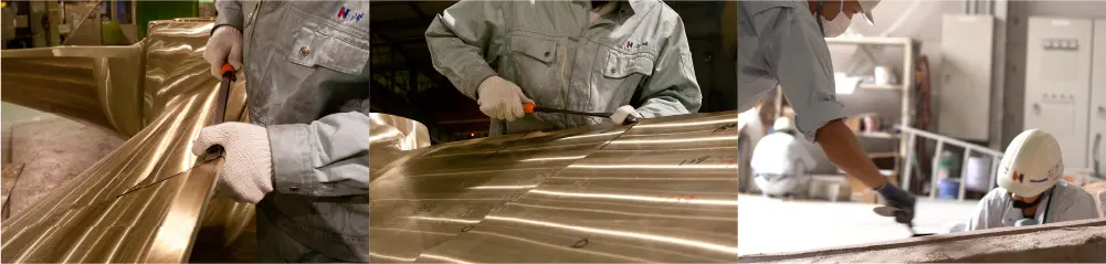 Craftsmanship is essential for one-off production and is particularly vital in forming the delicate curved surfaces of propeller blades—something that cannot be replicated by even the most advanced machining. While cast products are generally formed by first creating a pattern model and then a mold, our custom-built propellers—each designed to the optimal shape—are molded without using a pattern model. Instead, we use a unique mold fabrication method called the “mawashi-gata” (rotating mold) technique. The mold’s master shape is created, then positioned using NC data that defines displacement (angle and height) from reference points. Skilled workers manually interpolate between these points with sand to form an accurate mold surface. From the very first step of mold production, we are already pursuing an individually optimized shape. Moreover, craftsmanship also plays a vital role in the finishing process. Surface polishing that detects and smooths out deviations as small as 1/100 mm on the blade surface, and fitting work with the shaft, all rely on high-level skills and human sensitivity.